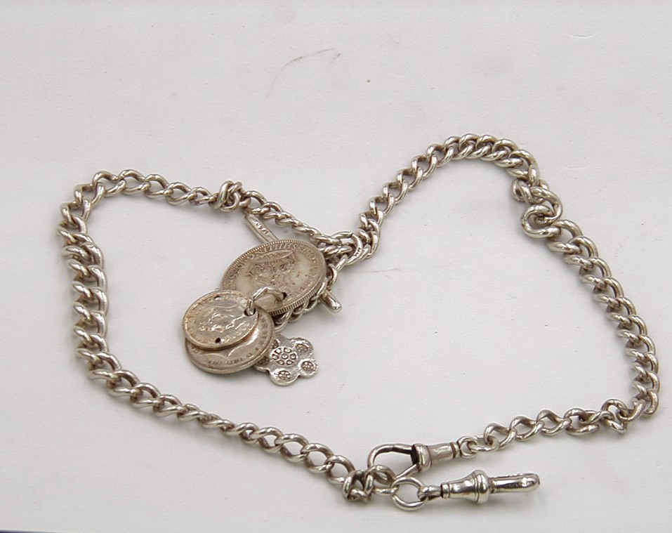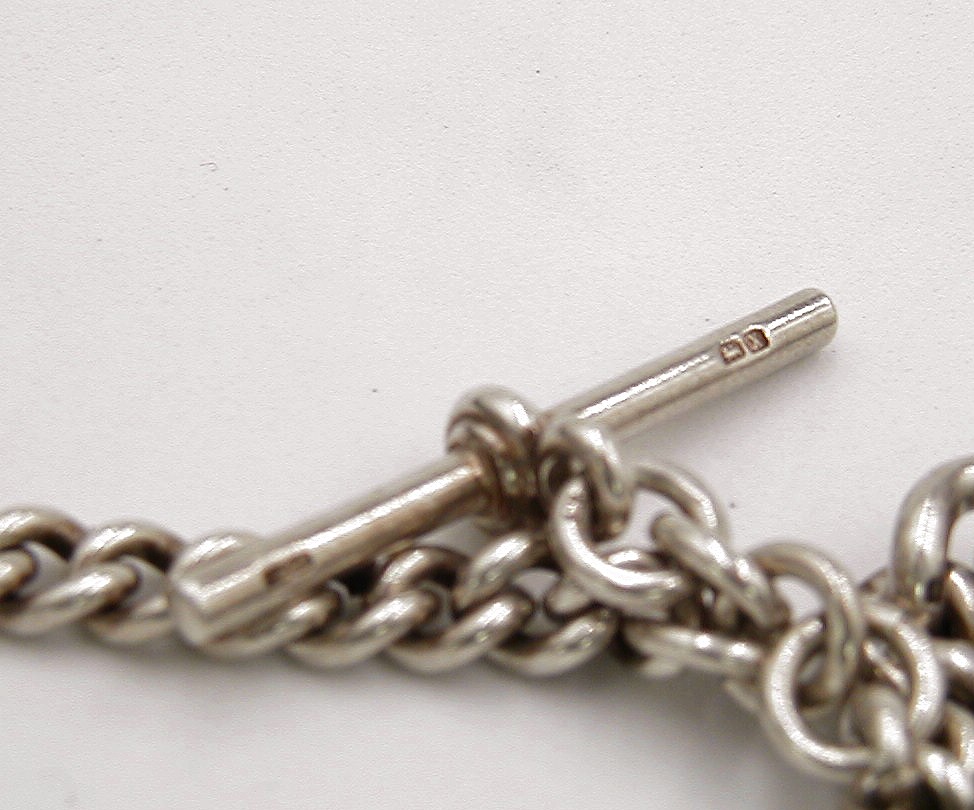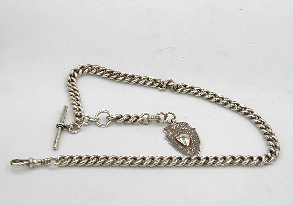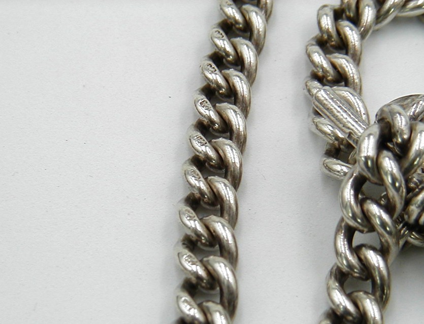 SILVER POCKET WATCH CHAIN AND F.O.B. BRITISH "BIRMINGHAM SHIELD" STRONG