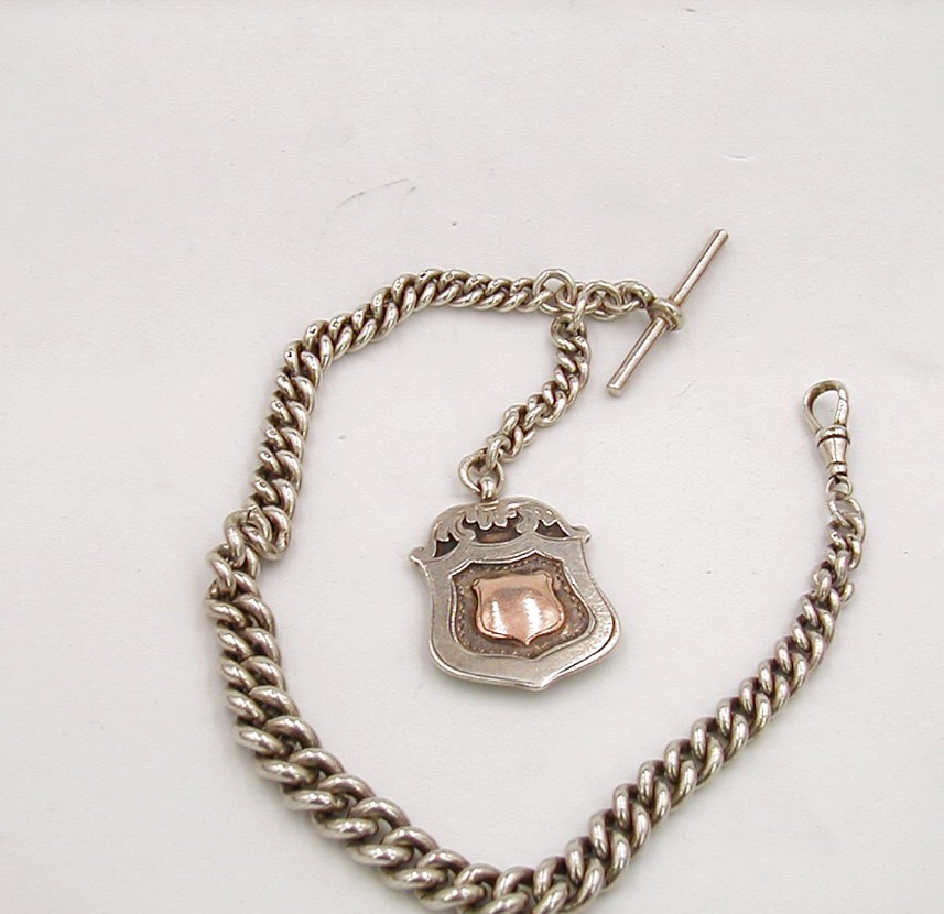 SILVER POCKET WATCH CHAIN AND F.O.B. BRITISH "BIRMINGHAM "SPEAR SHIELD" STRONG