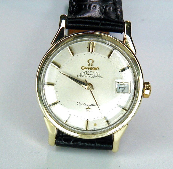 OMEGA GENUINE PIE PAN DIAL 14 KARAT AND STEEL CASE PERFECTLY SERVICED AND IT IS "ICONIC!" 1966STOCK NUMBER # OMEGA16950------This is an Iconic Omega timepiece from 1966. This is a genuine factory original champagne colour "Pie Pan" dial and left in it's original patina condition and adds a great vintage feeling indeed. This is a 14 karat solid gold pressed onto the mid case bezel and the lugs are capped with thick 14 karat gold onto stainless steel and I mean prob 1.5 mm thick of 14k. The back has a solid gold "Observation" disc and in nice clean condition. From lug to lug this Omega Constellation case is 42mm long and wide less the genuine Constellation gold crown it is 35mm. The case reference number is 168.005 which is correct for this 24 jewelled 561 caliber movement. The serial number for this automatic date movement is 24,425,865 which tells me the year of production and again it is 1966 and made at the Swiss Omega factory. Notice on the Oscillating bridge as it does read "Adjusted to 5 positions and temperature " as this is a certified Chronometre movement so expect a great timekeeper indeed. All 24 jewels have been inspected and I have added a new mainspring. The hands are original though I did replace the crystal and it is perfect with a date aperture window so easy to see the date. The band is leather at 18mm in width never worn not a bend.