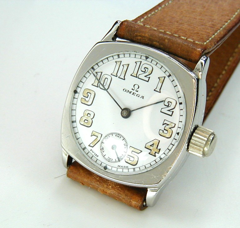 OMEGA STAINLESS STEEL CUSHION TRENCH WATCH WELL SERVICED 1938STOCK NUMBER # OMEGA3345------ Please note!! this is a boy's size as it is not a large piece, as from lug to lug this Omega signed case is 35mm and across not including the crown it is 30mm. The snap in back of this Omega case is with a mirror finish with no personal engravings. The serial number for this cushion case is 9,727,359. The crystal is glass and dome newly installed and perfect. This is an enamel dial with worn luminous material on the Arabic numbers though this is a near perfect enamel dial and with stick baton hands. Again this enamel dial is original and near perfect no kidding! The serial number for this 10.5 ligne Omega in house movement is 8,919,579 which tells me it was produced at the Omega Swiss factory in the year 1938 and with 15 clean and inspected jewels. As clean as one can expect and keeps crazy great time as I have installed a new mainspring as always! The band is Pig skin and 20mm in width never worn. Again this is a boy's size time piece and in all over super clean serviced condition :-)