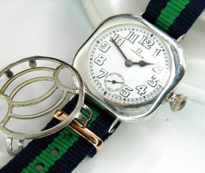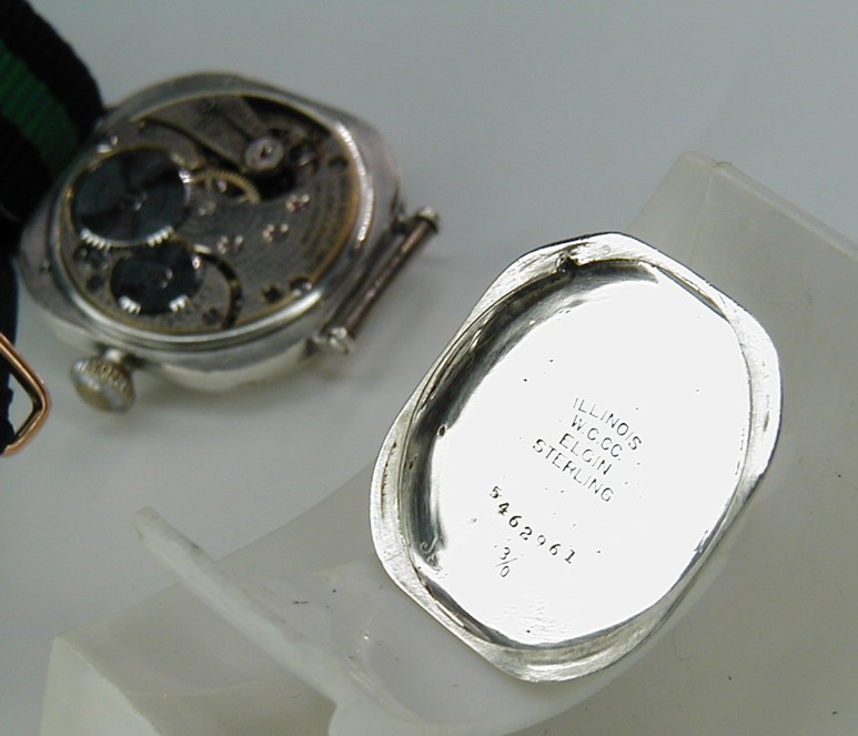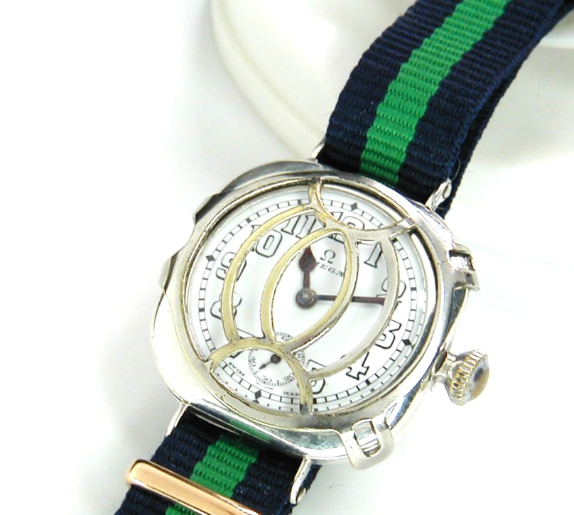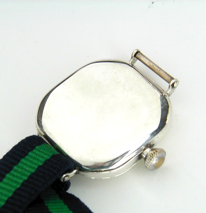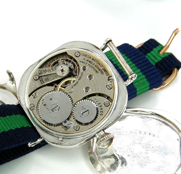 OMEGA STERLING SILVER CUSHION TRENCH WATCH AND ORIGINAL GRILL WELL SERVICED 10STOCK NUMBER # OMEGA3720------An incredible find and in awesome all over condition is this Sterling Silver genuine trench watch from the Omega Swiss factory. The crystal is glass and perfect not a flaw. The enamel dial is better than excellent with a tiny line from the middle where the hands are attached to 5 second marker on the small sweep hand and I mean small. The hands are thick military spec spade hands and made for this movement and case. This is a cushion Sterling Silver case and signed "Illinois / Elgin" and marked Sterling Silver indeed with the serial number 5,462,961. This is a 3/0 size case and the back is a snap in with a mirror finish and as you can see no personal engravings. The dial grill is original to this case and it is nickel with a thick silver coating and signed on the side "Pat Pend". There are many modern grills stamped out to fit many trench cases though be assured this grill is 100% legit and original. This is a 3/0 Omega in house movement and serviced to WOSTEP specs with never a short cut taken. I did install a new mainspring and changed the cap jewel on the balance cock and the end result is an excellent time keeper. The serial number for this gem is 5,268,271 which again tells me it is from the year 1918 and it is a world war 1 trench military piece. All 15 jewels have been inspected and all are perfect and I only use synthetic Mobious oils. The band is 14mm in width nylon and never worn. This is really a collectors dream as the condition is amazing!