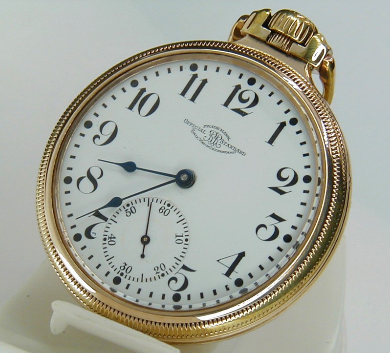 a gold round emblem and it the sign of a high grade Ball standard pocket watch.