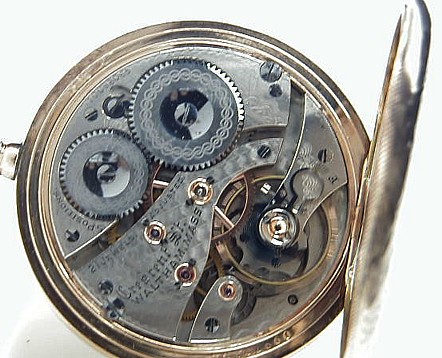 WALTHAM CRESCENT STREET 21 JEWELS AND SERVICED WHITE GOLD FILLED RAILROAD CASE 1920STOCK NUMBER # WALT222280------I have for sale a fully serviced 14 karat white gold filled railroad case and signed "Wadsworth quality". The case serial number is 0,225,179 and with no personal engravings at all but worn on the back and small at that. Across this bar over the crown case is 53mm so it is a 16 size. If you notice I did mention "bar over crown" as the crown keeps the crown safe and sound and hard to knock or break. The dial is enamel and very clean at that as it is a double sunk enamel piece. The hands are med railroad spade hands and the crystal is glass. This is a 1908 model movement signed "Crescent Street" and produced by the Waltham watch factory near Boston Mass, even the center wheel is solid gold! There are 21 clean and inspected jewels and all the jewels are in large raised solid gold jewel settings. This piece is well serviced and for sure keeps railroad time. The serial number for this railroad pocket watch is 23,015,114 which tells me it was produced in the year 1920. On the barrel bridge it does read "adjusted 5 positions" and this is a double roller model as well stem wind and lever set.600.00 USD |