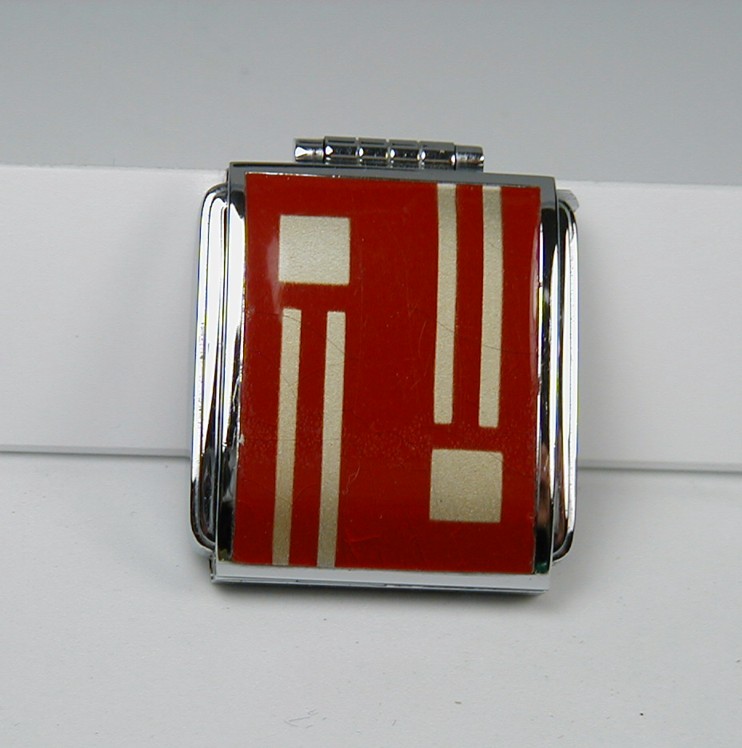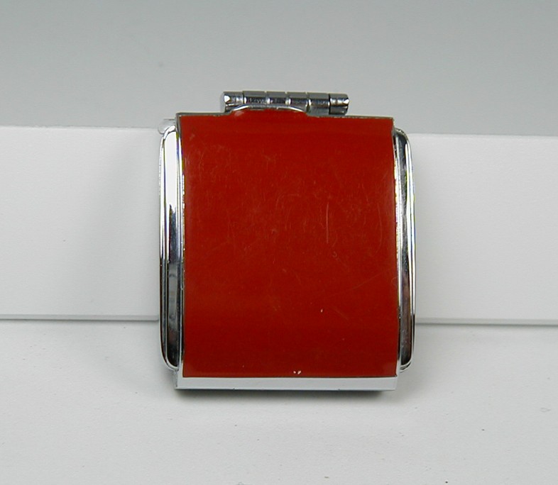 chain. The case is red enamel on both sides and crisp with a few lines. It opens
